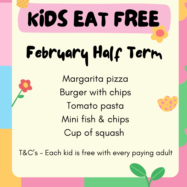 Kids eat free this February Half Term. Each kid meal is free with every paying adult.